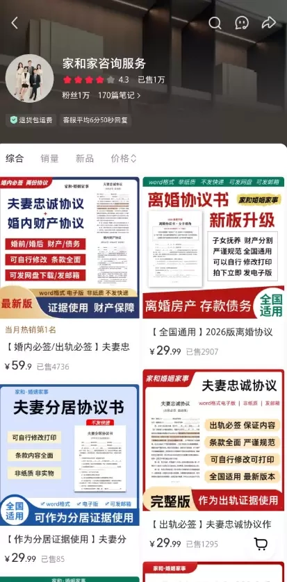 • 最近刷到一个小红书店铺,卖的东西挺有意思:夫妻忠诚协议、离婚协议模板这类虚拟资料。
