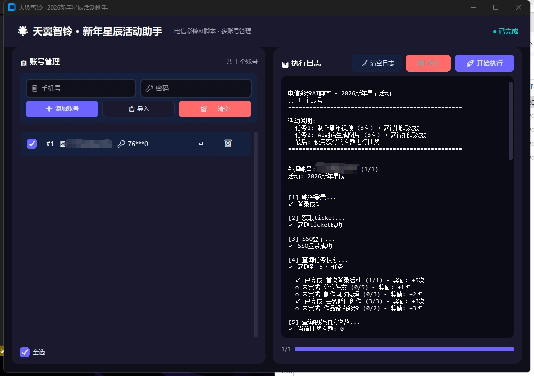 - 在软件里面输入手机号和密码,点开始运行即可开启全自动挂机
